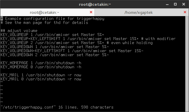 <blockquote class="tr_bq">“triggerhappy is a hotkey daemon developed with small and embedded systems in mind, e.g. linux based routers. it attaches to the input device files and interprets the event data received and executes scripts configured in its configuration.”</blockquote>[=] so let’s install triggerhappy